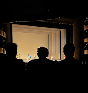 This week at NYCB, the dancers had the honor of performing Jerome Robbins' Glass Pieces for the composer himself! He sat discreetly in the back of the audience (near the usher's seat, which is how I was able to take this photos of Glass' head silhouetted against the stage.)