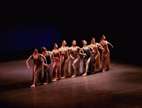 “The buzzing sound of the sixth section reunites the eight women—two units that compose themselves into one frieze, a chain of friendship. Some of the patterns recall the first section except that the figures at the end collapse forward, bent at the waist. A flute sounds. Stillness envelopes the stage as the dancers sit, stand and listen. Each places a hand across her own chest. Each then gently touches another--a hand to a cheek, a hand to another’s shoulder. At this point, Mr. Robbins leads the dancers into one linked frieze after another. ultimately, he creates a flattened strip: each woman stands, torso twisted to her left, the bottom half of her body in profile to the right.”